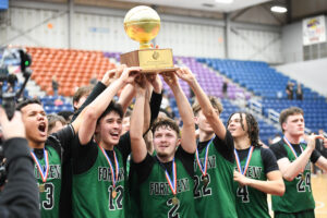 The Fort Kent boys hoist their Class C State Championship trophy to their fans in the bleachers at the Augusta Civic Center on Saturday evening.